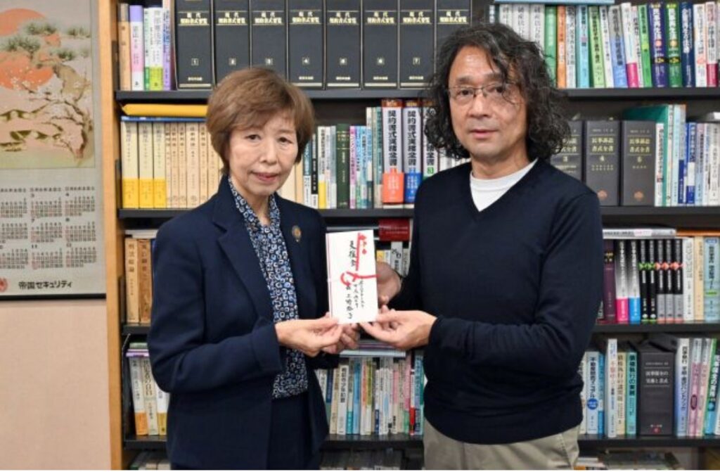 11月19日、帯広市内にて上野裕子会長より中村清人事務局長へ手渡しし、日頃の活動への敬意とともに、少しでもお力になれればとの思いをお伝えしました。